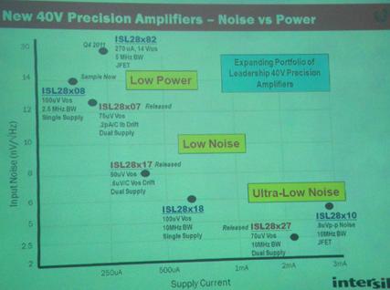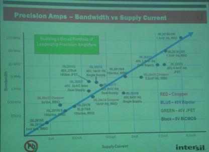 Intersil建立一個(gè)以精準(zhǔn)放大器為主的大系列產(chǎn)品,從最初的ISL28194到ISL28190/290產(chǎn)品,頻帶寬度和電流都有很大提升。
