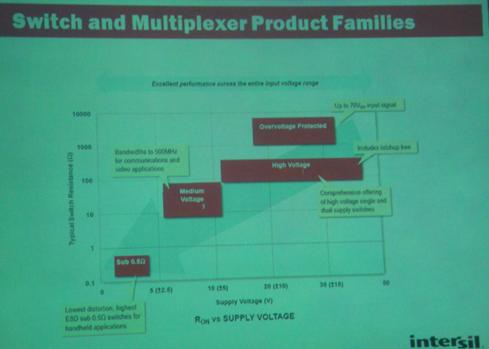 Roger還介紹了Intersil開關(guān)和多路復(fù)用器及接口產(chǎn)品線的情況,其sub 0.5Ω開關(guān)用于便攜應(yīng)用,中壓產(chǎn)品用于通信和視頻應(yīng)用,并且能提供高壓?jiǎn)?雙電源開關(guān)等。