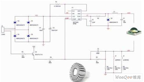 圖3:采用峰值電流控制的NCP1216非隔離型離線式LED驅(qū)動(dòng)應(yīng)用。