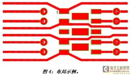 圖4顯示了RClamp2574N的流通型PCB走線。信號線連接到第1、2、4、5、6、7、9和10腳。第3腳與8腳連接到三個中心接地。在一個典型以太網(wǎng)應(yīng)用中,這些引腳以及接地都應(yīng)懸空(即不接地)。在本例中,走線寬度為0.005英寸。過孔用于第6、7、9和10腳的換層連接,這樣所有八根信號線都可采用易于實現(xiàn)的流通型(flow though)布局。
