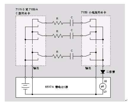 一個“同軸三柱-BNC”轉(zhuǎn)換器(7078-TRX-BNC型)被用于將6517A連接到7158型開關(guān)卡。電容器通過低噪聲同軸電纜連接到7158型開關(guān)卡??墒褂媒^緣線將7111-S開關(guān)卡連接到電容器。7169A型是通過接線頭連接器進行連接。