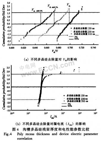 當(dāng)單位元胞相鄰間距為1.4 μm工藝時,由于設(shè)計的溝道長度大約為0.5μm,源區(qū)結(jié)深大致為0.3μm,不得不考慮到傳統(tǒng)工藝下源區(qū)注入時,多晶硅刻蝕工藝波動所帶來的器件性能下降的風(fēng)險。在傳統(tǒng)工藝中,當(dāng)多晶硅淀積完成后,須通過刻蝕來形成柵極區(qū)域,但是多晶硅去除量難以精準控制,同時考慮到刻蝕工藝面內(nèi)均勻性的特點,Si片內(nèi)中心與邊緣的去除量無法保證相同,從而為隨后的源區(qū)注人工藝留下了潛在的風(fēng)險。如圖2傳統(tǒng)TMOS與突起式TMOS工藝比較圖2(e)所示,當(dāng)源區(qū)注入時,如果柵極多晶硅刻蝕量過多,會導(dǎo)致源區(qū)高濃度的As+離子從柵極邊緣注入到溝道中,間接地減少了溝道長度,從而降低了閾值開啟電壓(Vth),尤其當(dāng)溝道長度較短時,甚至?xí)?dǎo)致器件在正常工作狀態(tài)時發(fā)生漏源間穿通效應(yīng),最終導(dǎo)致器件失效。本文采用K·Shenai的突起式結(jié)構(gòu),在形成溝槽之后,先保留之前所生長的氧化層,然后直接生長柵極氧化膜和多晶硅,在柵極多晶硅形成后,才將先前生長的氧化層去掉,由此便形成了突起式多晶硅結(jié)構(gòu),從而可以保證在隨后的源區(qū)As+離子注入時,As+離子無法從溝槽側(cè)壁注入到溝道中,從根本上避免了發(fā)生源漏極之間穿通的可能性,降低了器件對刻蝕工藝的依賴程度。這點在器件柵極氧化膜厚度較薄的情況下尤其明顯,此時如果采用傳統(tǒng)工藝,源區(qū)離子注入時,As+離子更容易從側(cè)壁注入到溝道中,從而影響溝道長度。