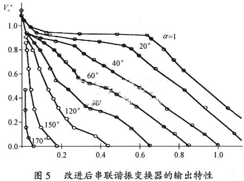 圖4中最大的功率曲線(α=1)即對應(yīng)于變換器開環(huán)工作,圖4中停留在底部的曲線是對應(yīng)于輕載的情況。工作在歸一化的輸出電流I*o=0.15%且ψ=1時,結(jié)果產(chǎn)生大約30%的過壓。改進(jìn)變換器的輸出特性為雙斜率輸出特性,使電路提高了電壓、電流限制的固有能力,改善了高壓電源的空、滿載的適應(yīng)性,同時有利于高壓電源寬范圍的輸出調(diào)節(jié)。