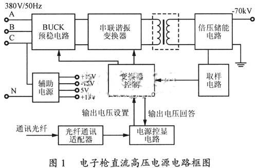 電子槍直流高壓電源采用380V/50Hz三相四線輸入,最高輸出直流電壓為負(fù)極性70kV,電源長期運行工作為-60kV左右,在滿足穩(wěn)定度要求條件下,輸出直流高壓電壓的連續(xù)可調(diào)范圍不小于-40~-70kV。