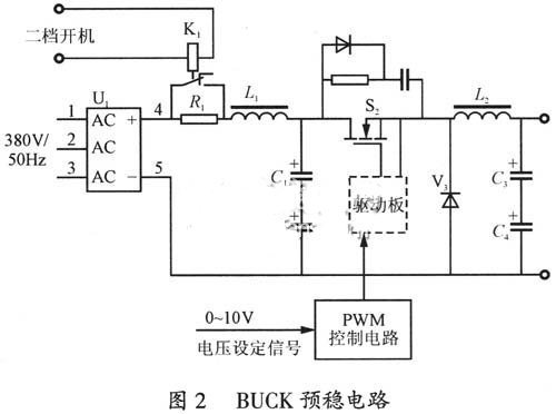 三相交流配電經(jīng)整流濾波電路之后,形成500V左右的直流電壓加在。BUCK預(yù)穩(wěn)電路的輸入端。其中K1為抑制合閘浪涌電壓而設(shè)置的,其二檔吸合信號由電源控顯電路給出。S2為BUCK功率開關(guān)管,其工作脈沖由PWM控制電路給出,為了保證電源具有足夠的動態(tài)特性,該功率開關(guān)管工作頻率為100kHz左右。PWM控制器輸出脈沖寬度,由電壓設(shè)定信號給出。當(dāng)電壓設(shè)定信號由0~10V變換時,PWM控制器輸出的脈沖占空比在0~0.85的范圍內(nèi)變化。L2為儲能電感,由于BUCK電路的占空比在0~0.85大范圍變化,為了保證電路起到預(yù)穩(wěn)作用,需要避免輸出電流斷續(xù),同時不至于設(shè)計余量過大,采用了額定負(fù)載條件下的計算值,實際工作情況良好。