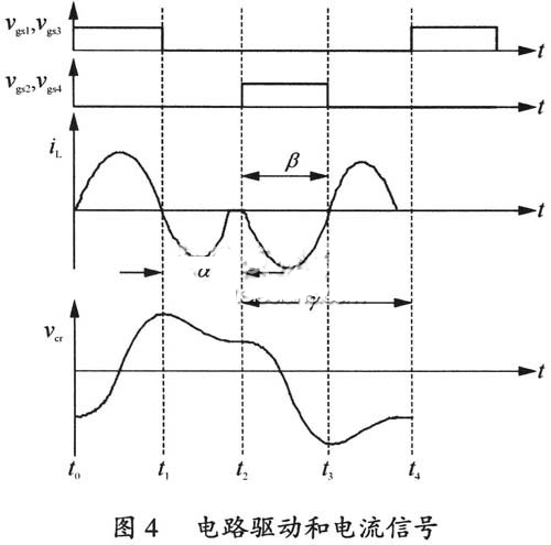 電路的諧振槽路的電流波形和驅(qū)動信號波形如圖4所示,通過調(diào)節(jié)α角控制變換器的輸出功率。
