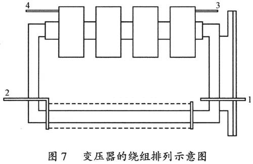 為了減少高壓繞組和低壓繞組之間的分布電容,確保高壓繞組和低壓繞組之間的絕緣,需要將原邊繞組繞制在矩形鐵心的一邊,副邊繞組繞制在矩形鐵心的另一邊,并留足原、副邊間的距離,最后用環(huán)氧樹脂灌注作為主絕緣。