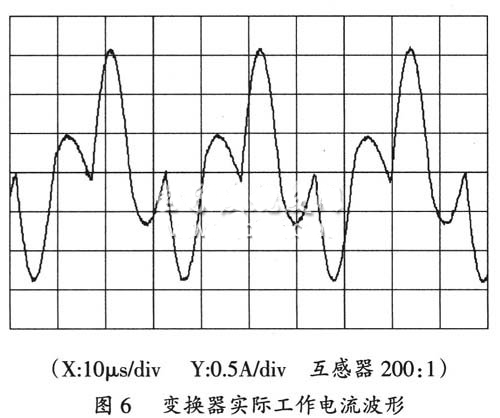 整個變換器電路依然采用PFM的工作模式,當(dāng)前級預(yù)穩(wěn)電源輸出0~500V直流電壓時,變換器以固定的脈沖寬度驅(qū)動橋臂的功率開關(guān)管。為了保證電源在電子槍束流產(chǎn)生時能穩(wěn)定工作,設(shè)計了取樣閉環(huán)控制功能,當(dāng)輸出偏離電壓設(shè)定值時,變換器通過脈沖頻率調(diào)節(jié)得到穩(wěn)定的輸出,電子槍高壓電源實際工作頻率為3~25kHz。改進(jìn)后的串聯(lián)諧振變換器如圖5所示,變換器的實際工作電流波形如圖6所示。