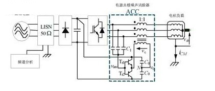 傳統(tǒng)的用于消除共模電壓的有源濾波器如圖8所示,文獻(xiàn)將其稱為有源共模噪聲消除器,acc連接在逆變器的輸出端和三根電纜之間,由共模電壓傳感器、補(bǔ)償電路和共模變壓器組成,acc在逆變器輸出端疊加一個補(bǔ)償電壓,該補(bǔ)償電壓與pwm逆變器產(chǎn)生的共模電壓極性相反、幅值相等,從而使施加在負(fù)載上的共模電壓被完全消除,也就減小了共模電流和傳導(dǎo)emi。