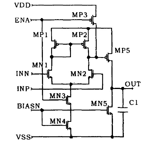 過放電檢測電路(VD2)可利用一個二級開環(huán)比較器來實(shí)現(xiàn),如圖2所示。在設(shè)計(jì)中應(yīng)采用差分輸入并盡可能地提高增益,以滿足精度要求。該電路中,第一級是由MN1,MN2,MP1,MP2,MN3,MN4組成的差分放大器。第二級是由MP5,MN5組成的單級放大器。前級放大器放大輸入的差模信號,后一級將前級的輸出進(jìn)一步放大,以達(dá)到數(shù)字信號的輸出電平。該比較器電路的直流增益為: