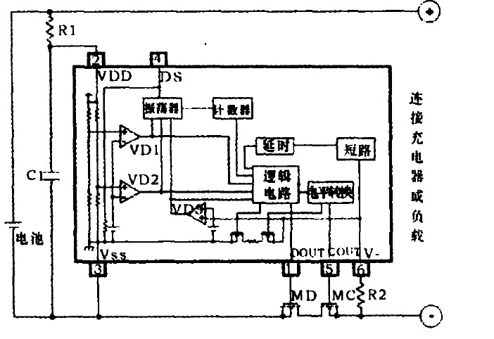 在放電時,若電池電壓低于過放電檢測電壓并保持相應(yīng)的延遲時間,DOUT端由高電位變?yōu)榈碗娢?,放電控制MOS管MD關(guān)斷,芯片進(jìn)入過放電保護(hù)模式,停止放電。