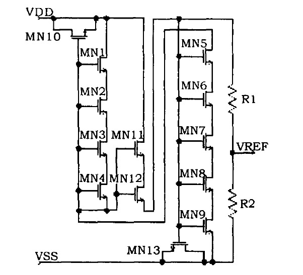 基于耗盡型NMOS管閾值電壓為負(fù)值,在VGS=0時也處于工作狀態(tài),該特性可有效降低其工作電壓及功耗。因而,該基準(zhǔn)電路中利用串聯(lián)的耗盡型NMOS管MN1-MN4、串聯(lián)的增強(qiáng)型NMOS管MN5-MN9、MN11-MN12和電阻R1、R2構(gòu)成基于VGS的基準(zhǔn)電壓電路,該基準(zhǔn)電路的輸出為檢測比較器反相端的基準(zhǔn)電壓信號VREF。