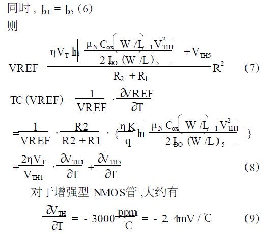 即對于增強(qiáng)型NMOS管,VTH隨溫度升高而下降,而對于耗盡型NMOS管,VTH為負(fù)值,其絕對值隨溫度升高而上升。由此推得,當(dāng)選取合適的參數(shù)時,本電路的溫度漂移可以控制在較小范圍內(nèi)。