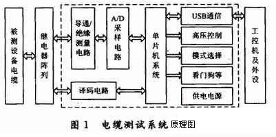 電纜測(cè)試系統(tǒng)主要由工控機(jī)系統(tǒng),單片機(jī)系統(tǒng)和繼電器陣列三部分構(gòu)成。其中工控機(jī)負(fù)責(zé)人機(jī)交互和數(shù)據(jù)處理,單片機(jī)系統(tǒng)控制硬件電路完成相應(yīng)動(dòng)作,繼電器陣列負(fù)責(zé)響應(yīng)譯碼電路的請(qǐng)求將外部電纜接入測(cè)試系統(tǒng)。單片機(jī)和工控機(jī)通過(guò)USB進(jìn)行通信。如圖1所示。