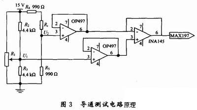 由于導(dǎo)通電阻很小,一般為歐姆級(jí),容易受到外界干擾的影響,惠斯登電橋的兩臂同時(shí)對(duì)電源的微小變化做出反應(yīng),將輸出信號(hào)送入差分放大器,從而消除了共模干擾,可以提高測(cè)試的準(zhǔn)確性。其原理如圖3所示。