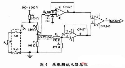 對(duì)于絕緣測(cè)試電路而言,由于輸入測(cè)試電壓為500~1 000 V,對(duì)干擾不太敏感,所以絕緣測(cè)試電路采用相對(duì)簡(jiǎn)單的電阻分壓法來(lái)實(shí)現(xiàn)。