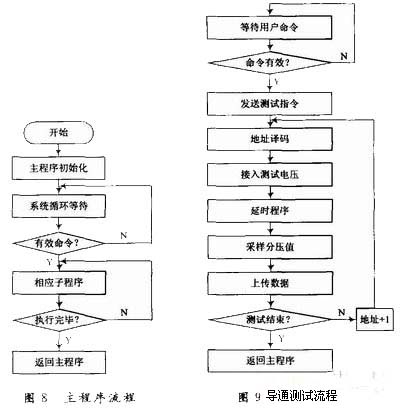 電纜測(cè)試系統(tǒng)由單片機(jī)和工控機(jī)共同作用來(lái)實(shí)現(xiàn),工控機(jī)的人機(jī)交互界面將操作者輸入的信息通過(guò)USB發(fā)送給單片機(jī),單片機(jī)根據(jù)這些命令啟動(dòng)相應(yīng)的外設(shè),實(shí)現(xiàn)相應(yīng)的測(cè)試功能。電纜測(cè)試系統(tǒng)可實(shí)現(xiàn)系統(tǒng)自檢,全部導(dǎo)通/絕緣測(cè)試,單獨(dú)兩點(diǎn)之間導(dǎo)通/絕緣測(cè)試和指定區(qū)間內(nèi)兩點(diǎn)間導(dǎo)通/絕緣測(cè)試。單片機(jī)的工作流程如圖 8所示。