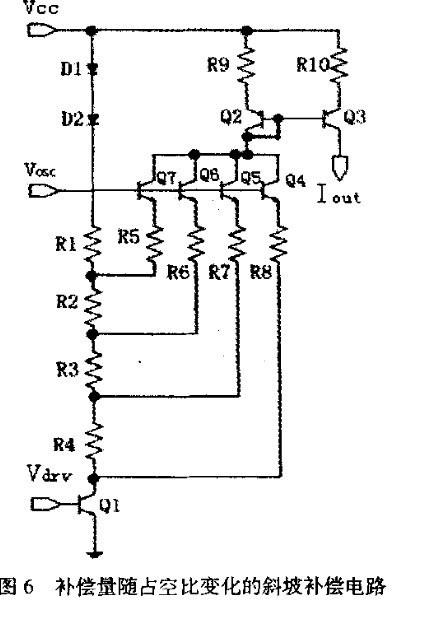 因為 Q4 ,Q5,Q 6和Q7是先后開啟的,所以補(bǔ)償電流在時間軸上的斜率dlout/dt將隨著Vosc的增大而增大,即斜坡補(bǔ)償?shù)牧侩S占空比增大而增大。