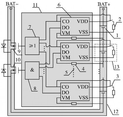 采用單節(jié)鋰電池保護芯片設計的具備均衡充電能力的鋰電池組保護板示意圖如圖1所示。其中:1為單節(jié)鋰離子電池;2為充電過電壓分流放電支路電阻;3為分流放電支路控制用開關器件;4為過流檢測保護電阻;5為省略的鋰電池保護芯片及電路連接部分;6為單節(jié)鋰電池保護芯片(一般包括充電控制引腳CO,放電控制引腳DO,放電過電流及短路檢測引腳VM,電池正端VDD,電池負端VSS等);7為充電過電壓保護信號經(jīng)光耦隔離后形成并聯(lián)關系驅動主電路中充電控制用MOS管柵極;8為放電欠電壓、過流、短路保護信號經(jīng)光耦隔離后形成串聯(lián)關系驅動主電路中放電控制用MOS管柵極;9為充電控制開關器件;10為放電控制開關器件;11為控制電路;12為主電路;13為分流放電支路。單節(jié)鋰電池保護芯片數(shù)目依據(jù)鋰電池組電池數(shù)目確定,串聯(lián)使用,分別對所對應單節(jié)鋰電池的充放電、過流、短路狀態(tài)進行保護。該系統(tǒng)在充電保護的同時,通過保護芯片控制分流放電支路開關器件的通斷實現(xiàn)均衡充電,該方案有別于傳統(tǒng)的在充電器端實現(xiàn)均衡充電的做法,降低了鋰電池組充電器設計應用的成本。