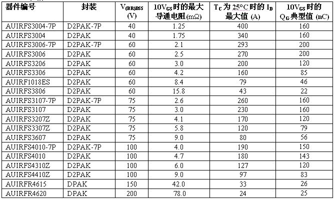 全新溝道 HEXFET 功率 MOSFET 系列采用多款表面貼裝器件 (SMD) 封裝,電壓范圍從 40V 至 200V。標(biāo)準(zhǔn)和邏輯電平柵級驅(qū)動 MOSFET 都為 IR 車用塑料封裝 MOSFET 產(chǎn)品系列設(shè)定了導(dǎo)通電阻性能新標(biāo)準(zhǔn)?;鶞?zhǔn)導(dǎo)通電阻在 40V 下最大為 1.25 毫歐,60V 下最大為2.1 毫歐,75V 下為 2.6 毫歐,100V 下為 4.0 毫歐。在 D2Pak-7P 封裝中許多器件的最大額定電流達(dá) 240A。