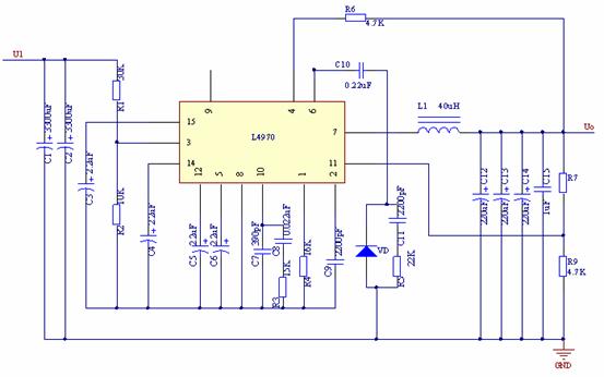 L4970A芯片的輸出電壓設定為10.8V,其輸出電阻R7由下式確定:
