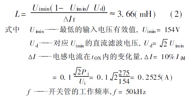 我們設(shè)計(jì)開關(guān)管的工作頻率為50kHz, Rt= 11. 2kΩ , C t= 2. 2nF, 輸入電壓Ui 范圍為220V+ 20%- 30%, 直流電壓Ud = √2Ui, DC/ DC 的輸出功率為250W, 輸入功率為275W, 效率η=91%, 根據(jù)公式計(jì)算校正電感: