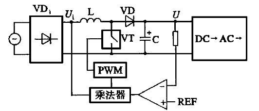 高頻有源PFC 是根據(jù)電網(wǎng)的電壓、電流及負(fù)載的變化產(chǎn)生PWM 信號, 控制高頻電子開關(guān)導(dǎo)通的, 可起調(diào)節(jié)電感L 的作用。改善電流波形, 利用乘法器控制PWM 信號, 可使電網(wǎng)的輸入電流基本為正弦波, 使λ接近于1( 即大于0. 99) 。圖1 示出PFC 的原理框圖。