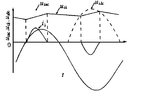 圖中,uiac為電網(wǎng)電壓波形;uidc 為經(jīng)V1 整流出的波形;uci 為輸入濾波電解電容的電壓波形;i i 為輸入電流波形。