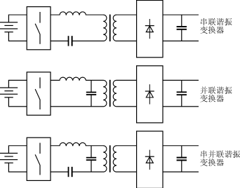 圖12給出這些基本的諧振變換器拓?fù)涫疽鈭D。在串聯(lián)諧振變換器中,諧振電感與變壓器原邊串聯(lián),而其他類型變換器中,電容與變壓器串聯(lián)。只有串聯(lián)諧振變換器是硬電流源特性,而其他類型變換器是硬電壓源型。