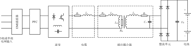 圖2給出電動汽車感應(yīng)耦合充電系統(tǒng)的簡化功率流圖。圖中,輸入電網(wǎng)交流電經(jīng)過整流后,通過高頻逆變環(huán)節(jié),經(jīng)電纜傳輸通過感應(yīng)耦合器后,傳送到電動汽車輸入端,再經(jīng)過整流濾波環(huán)節(jié),給電動汽車車載蓄電池充電。