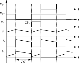 當(dāng)原邊開關(guān)管S1及S2均開通時,能量儲存在輸入濾波電感中,同時輸出整流管處于關(guān)斷態(tài)。當(dāng)開關(guān)管S1及S2中任一個開關(guān)管關(guān)斷時,儲存能量通過原邊繞組傳輸?shù)礁边叀S捎谧儞Q器的對稱工作,變壓器磁通得以復(fù)位平衡。