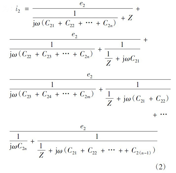 在僅二次繞組有感應(yīng)電動勢、一次繞組電動勢為零的情況如圖6 所示。圖6 中:e2為每匝二次繞組的感應(yīng)電動勢;C2x為一匝二次繞組與一次繞組最外層間的寄生電容。