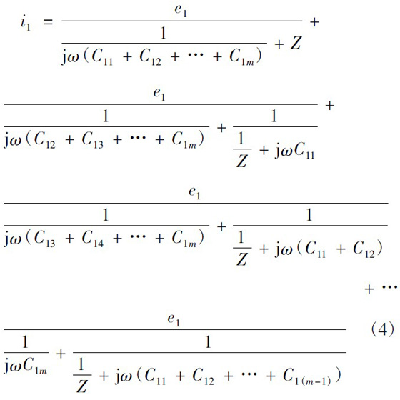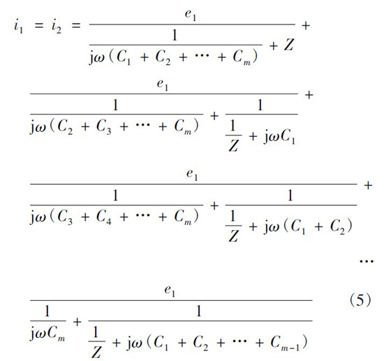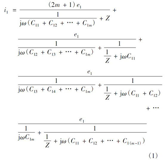 設(shè)一次繞組有3 層,每層m 匝,二次繞組僅一層,為n 匝。當(dāng)變壓器磁芯中的磁通發(fā)生變化,便會同時在一次側(cè)和次級產(chǎn)生感應(yīng)電動勢。根據(jù)疊加定理,可認(rèn)為這是僅一次繞組有感應(yīng)電動勢、二次繞組電動勢為零和僅二次繞組有感應(yīng)電動勢、一次繞組電動勢為零兩種情況的疊加。僅一次繞組有感應(yīng)電動勢、二次繞組電動勢為零的情況如圖5 所示。圖5 中:e1為每匝一次繞組的感應(yīng)電動勢;C1x為一匝最外層一次繞組與二次繞組間的寄生電容。