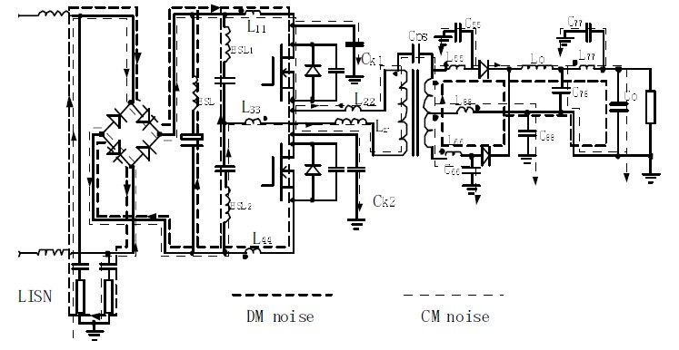 通常電路中的共模干擾和差模干擾是同時(shí)存在的,共模干擾存在于電源的任意一個(gè)相線與大地之間,差模干擾存在于相線與相線之間。法國Grenoble 電技術(shù)實(shí)驗(yàn)室的Teuling、Schnaen 和Roudet 基于由MOSFET 構(gòu)成的400W、開關(guān)頻率為100KHz 的斬波電路實(shí)驗(yàn)?zāi)P偷难芯勘砻?,低頻時(shí)差模干擾占主導(dǎo)地位;高頻時(shí),共模干擾占主導(dǎo)地位,這說明開關(guān)電源的差模干擾和共模干擾對(duì)電路的影響程度是不同的;另一方面,線路寄生參數(shù)對(duì)差模干擾和共模干擾的影響也不同,由于線間阻抗與線———地阻抗不同,干擾經(jīng)長距離傳輸后,差模分量的衰減要比共模大。因此,為了解決開關(guān)電源的傳導(dǎo)噪聲問題,需要首先區(qū)分共模和差模干擾,這就需要建立共模和差模噪聲路徑,然后對(duì)它們分別進(jìn)行仿真和分析,這種方法便于我們找到電磁干擾問題的根源,便于問題的解決。