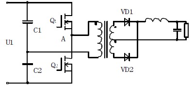 在PWM變換器工作時(shí),伴隨著開關(guān)器件的工作,也相應(yīng)產(chǎn)生了共模噪聲。如圖1 所示,對(duì)于半橋變換器,開關(guān)管Q1 的漏級(jí)電壓始終為U1,源級(jí)電位隨開關(guān)狀態(tài)的改變而在0 和U1/2 之間變化;Q2 的源極電位始終為0,漏極電位在0 和U1/2之間變化。為使開關(guān)管和散熱器能保持良好接觸,往往在開關(guān)管底部與散熱器之間加上絕緣墊片或者抹上導(dǎo)熱性能良好的絕緣硅膠。這使得A 點(diǎn)對(duì)地之間相當(dāng)于存在一個(gè)并聯(lián)耦合電容CK。當(dāng)開關(guān)管Q1、Q2 的狀態(tài)發(fā)生改變,使A 點(diǎn)電位發(fā)生變化時(shí),就會(huì)在CK 上產(chǎn)生噪聲電流Ick,如圖2 所示。該電流由散熱器到達(dá)機(jī)殼,而機(jī)殼也即大地與主電源線存在耦合阻抗,形成圖2中虛線所示的共模噪聲通路。于是,共模噪聲電流在地與主電源線的耦合阻抗Z 上產(chǎn)生壓降,形成共模噪聲。