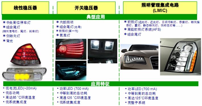 驅(qū)動(dòng)LED的開關(guān)穩(wěn)壓器的能效一般介于50%至90%之間,涉及降壓、升壓及降壓-升壓等不同拓?fù)浣Y(jié)構(gòu),講究EMI控制方法,主要用于汽車內(nèi)部照明、停車燈、霧燈、日間行車燈及側(cè)面標(biāo)志燈等應(yīng)用。