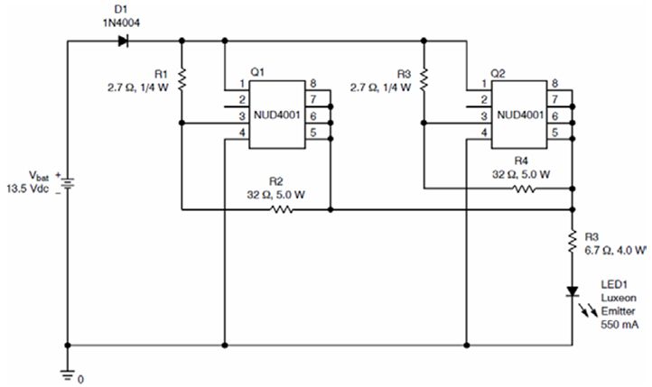 圖4:NUD4001在汽車停車燈中的應(yīng)用示例[page]