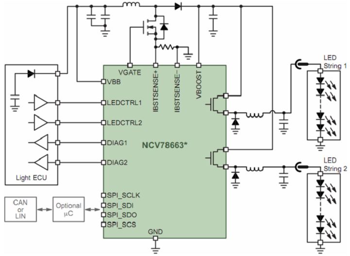一般而言,汽車前照燈要求支持從單個(gè)LED到多串LED,電壓可高達(dá)60 V;此外,還要求支持脈寬調(diào)制(PWM)調(diào)光(如用于示廓燈)、高集成度、高能效、LED串低電磁輻射、集成診斷及通信接口等。安森美半導(dǎo)體針對(duì)LED汽車前照燈系統(tǒng)開發(fā)了NCV78663電源鎮(zhèn)流器及雙LED驅(qū)動(dòng)器。NCV78663是先進(jìn)的高可靠性、高能效的系統(tǒng)級(jí)芯片(SoC) LED驅(qū)動(dòng)器,支持達(dá)2 A電流,提供高于90%的總能效,驅(qū)動(dòng)高達(dá)60 V電壓的多串LED,能以PWM調(diào)光維持色溫及控制平均電流,使設(shè)計(jì)人員能夠以一顆高集成度的SoC控制遠(yuǎn)光燈及近光燈、日間行車燈、轉(zhuǎn)向指示燈及霧燈,所需外部元件極少。這器件通過SPI接口與外部微控制器通信,在上電后動(dòng)態(tài)地控制系統(tǒng)參數(shù)、檢測(cè)LED工作狀態(tài)并反饋診斷信息。圖8顯示的是NCV78663在先進(jìn)的汽車前照燈應(yīng)用中的電路圖。