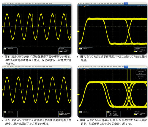 之所以出現(xiàn)抖動,是因為AFG擁有固定的取樣速率,其不是數(shù)據(jù)速率的倍數(shù)。AWG則沒有這種限制(盡管任何實際環(huán)境信號源都會產(chǎn)生某些抖動)。