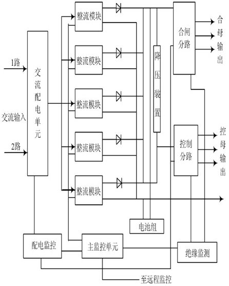 智能高頻開關(guān)電源系統(tǒng)的總體結(jié)構(gòu)主要由主監(jiān)控單元、配電模塊、交流配電單元、整流模塊等組成, 系統(tǒng)總體的結(jié)構(gòu)圖如圖1 所示。系統(tǒng)中的各個(gè)監(jiān)控單元受主監(jiān)控單元的管理和控制, 通過通信線將各個(gè)監(jiān)控單元采集的信息送給主監(jiān)控統(tǒng)一管理。主監(jiān)控顯示直流系統(tǒng)各種信息, 用戶也可以觸摸顯示屏查詢信息及操作,系統(tǒng)信息還可以接入到遠(yuǎn)程監(jiān)控系統(tǒng)中。系統(tǒng)除了交流監(jiān)控、直流監(jiān)控、開關(guān)量監(jiān)控等基礎(chǔ)單位外, 還配置了絕緣監(jiān)測、降壓裝置、電池巡檢等功能單元, 以達(dá)到對直流系統(tǒng)進(jìn)行全面監(jiān)控的目的。