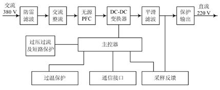本文設(shè)計(jì)的整流模塊的工作原理框圖如圖2 所示,工作時(shí), 模塊首先通過過防雷處理和濾波對輸入的三相交流進(jìn)行處理, 這樣才能保證模塊后級電路的安全; 經(jīng)過處理后的三相交流經(jīng)過整流和無源PFC 后轉(zhuǎn)換成高壓直流時(shí), 這時(shí)轉(zhuǎn)換的高壓直流要經(jīng)過DC/ DC 變換器再次轉(zhuǎn)換成可變的直流電壓輸出; 另外模塊控制部分還有負(fù)責(zé)過壓、過流以及短路保護(hù)等作用, 這樣才能保證輸出電壓的穩(wěn)定, 也同時(shí)能對模塊各部件進(jìn)行保護(hù)。模塊還在遠(yuǎn)程監(jiān)控中提供了 四遙 ( 遙控、遙調(diào)、遙測、遙信) 接口。
