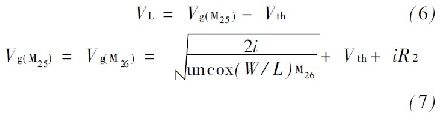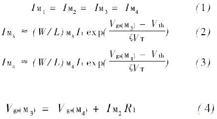 式中: K = (W/ L ) M4 / ( W/ L ) M3 ,通過式(5) 可以發(fā)現(xiàn),偏置電流I M1 , I M2與輸入電源無關(guān)。