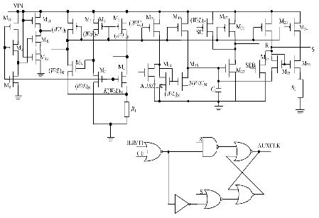 SE 為輔助振蕩器切換信號, SEB 為SE 的反信號。當V DD低于1. 9 V 時, SE 為高電平, M17 , M18 都截止, 不影響R, S 觸發(fā)器的翻轉(zhuǎn), 輔助振蕩器工作, 開關(guān)S1 斷開, S2 閉合; 當VDD 高于1. 9 V 時, SE 為低電平, 輔助振蕩器關(guān)斷, 開關(guān)S1 閉合, S2 斷開, M17 , M18 都導通, R=1, S= 0, AU XCLK 被鎖定為高電平, 既減小了功耗, 也避免了輔助振蕩器關(guān)斷之后R, S 端出現(xiàn)不確定狀態(tài)。