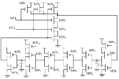 本文所設(shè)計的主振蕩器采用如圖2 所示的環(huán)形振蕩器結(jié)構(gòu)。VC1, VC2 分別為過壓保護電路, PWM 比較器的輸出信號, MP10和MP11 為帶隙基準提供的鏡像電流, 合理的控制鏡像電流和電容C1 , C2 的大小, 即能夠使主振蕩器在1. 9~ 8 V 的V DD區(qū)間輸出350 kHz 左右較穩(wěn)定的振蕩頻率。