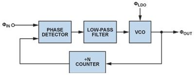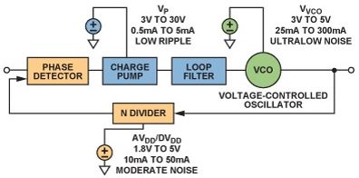鎖相環(huán)(PLL)是現(xiàn)代通信系統(tǒng)的基本構建模塊PLLs通常用在無線電接收機或發(fā)射機中,主要提供"本振"(LO)功能;也可用于時鐘信號分配和降噪,而且越來越多地用作高采樣速率模數(shù)或數(shù)模轉(zhuǎn)換的時鐘源。由于每一代PLL的噪聲性能都在改善,因此電源噪聲的影響變得越來越明顯,某些情況下甚至可限制噪聲性能。本文討論圖1所示的基本PLL方案,并考察每個構建模塊的電源管理要求。