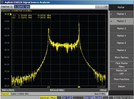 另一種方法:將低頻方波直流耦合至電源內(nèi),同時觀察VCO頻譜任一側(cè)上的頻移鍵控 (FSK)調(diào)制峰值(圖2)。峰值間頻率偏差除以方波幅度,便得出VCO推壓系數(shù)。該測量方法比靜態(tài)直流測試更精確,因為消除了與直流輸入電壓變化相關的任何熱效應。圖2顯示ADF4350 VCO輸出在3.3 GHz、對標稱3.3 V電源施加10 kHz、0.6 V p-p方波時的頻譜分析儀曲線圖。對于1.62 MHz/0.6 V或2.7 MHz/V的推壓系數(shù),最終偏差為3326.51 MHz – 3324.89 MHz = 1.62 MHz.該結(jié)果可與表1中的靜態(tài)測量 2.3 MHz/V比較。