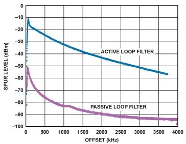 電荷泵將鑒相器誤差電壓轉(zhuǎn)換為電流脈沖,并通過PLL環(huán)路濾波器進行積分和平滑處理。電荷泵通??稍谧疃嗟陀谄潆娫措妷海╒P)0.5 V的電壓下工作。例如,如果最大電荷泵電源為5.5 V,那么電荷泵只能在最高5 V輸出電壓下工作。如果VCO需要更高的調(diào)諧電壓,則通常需要有源濾波器。有關實際PLL的有用信息和參考設計,請參見電路筆記CN-0174,5,處理高壓的方式請參見利用高壓VCO設計高性能鎖相環(huán),"6該文章發(fā)表于模擬對話第43卷第4期(2009)。有源濾波器的替代方案是使用PLL和針對更高電壓設計的電荷泵,例如ADF4150HV ADF4150HV可使用高達30 V的電荷泵電壓工作,從而在許多情況中省去了有源濾波器。