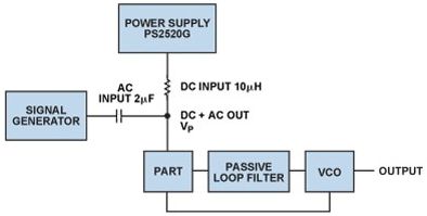 電荷泵的低功耗使其看似頗具吸引力,可使用升壓轉(zhuǎn)換器從較低的電源電壓產(chǎn)生高電荷泵電壓,然而與此類DC-DC轉(zhuǎn)換器相關的開關頻率紋波可能在VCO的輸出端產(chǎn)生干擾雜散音。高PLL雜散可能造成發(fā)射機發(fā)射屏蔽測試失敗,或者降低接收機系統(tǒng)內(nèi)的靈敏度和帶外阻塞性能。為幫助指導轉(zhuǎn)換器紋波的規(guī)格,使用圖6的測量設置針對各種PLL環(huán)路帶寬獲得全面電源抑制曲線圖與頻率的關系。