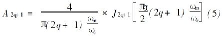 式中, q= 0, 1, 2, ……∝;ω m 是調(diào)制頻率; ωc 是載波頻率; ωm ≤ωc , a是調(diào)制指數(shù); J v ( z) 是第一類Bessel 函數(shù)。公式( 5) 只適用于頻率范圍遠(yuǎn)遠(yuǎn)低于載波頻率, 此時在一次波段的載波頻率可以忽略不計(jì)。在本文的系統(tǒng)研究中, m / c= 1/ 90 適用于規(guī)定計(jì)算, 并假設(shè)調(diào)制指數(shù):