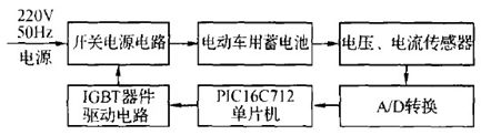 目前,電動車電池作為一種儲能裝置,主要以鉛酸蓄電池為主,充電器是專門針對鉛酸蓄電池所設計的。傳統(tǒng)的蓄電池充電器采用電流/電壓負反饋的方法來達到恒流/恒壓充電的目的,為了實現(xiàn)充電過程各種工作參量的實時監(jiān)測及智能多段式充電策略的精確控制,引入電流/電壓反饋環(huán),應用P IC16C712 單片機及相應的控制電路,其硬件結構框圖如圖1所示,電路圖如圖2所示。